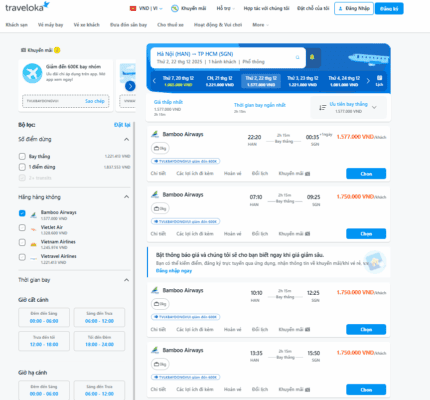 Đặc biệt, tính năng “Thông báo giá” trên Traveloka cho phép người dùng theo dõi mức giá của cùng một chặng bay trong nhiều ngày, giúp lựa chọn thời điểm bay tiết kiệm nhất. Đây là công cụ rất hữu ích với tuyến Hà Nội – TP.HCM, nơi giá vé có thể biến động theo từng ngày, thậm chí từng khung giờ.